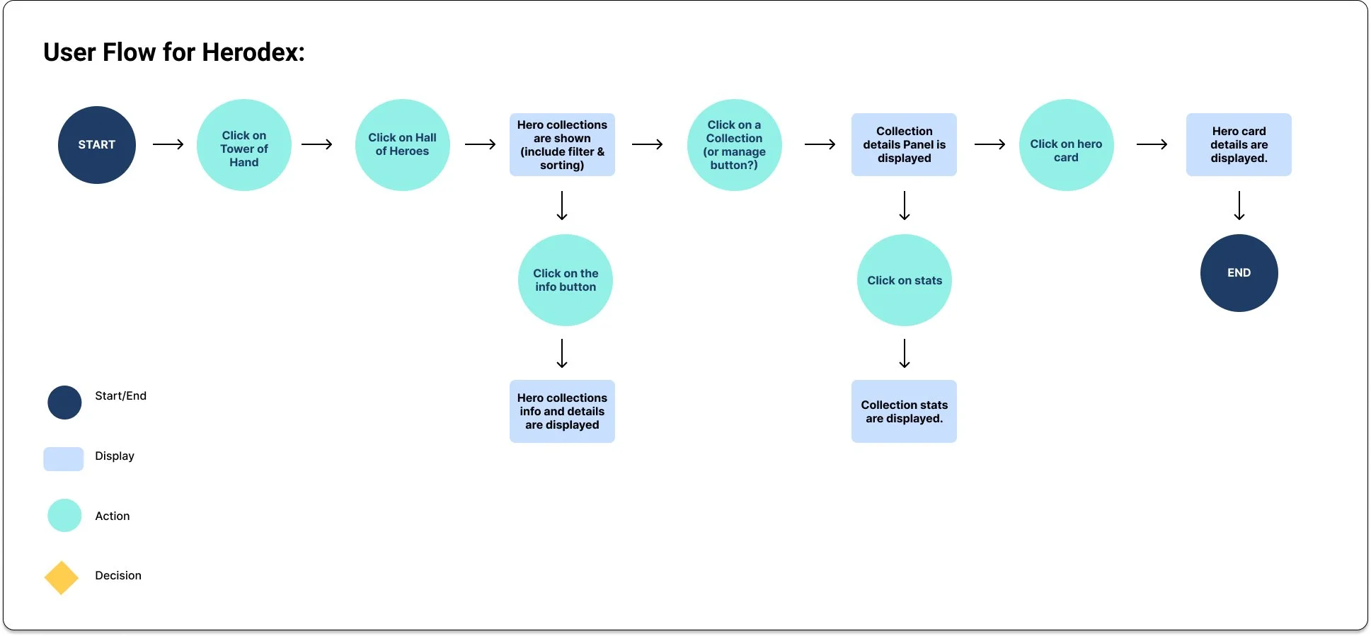 The flowchart begins with the user going into the Tower of Hand building, and clicking the “Hall of Heroes” tab. The hero collections, filter button, sorting button and info button are shown. I thought of different users that would interact with this new feature. A new player would more than likely go to the info button to learn more. A more experience player would observe the collections, details and stats. While designing the experience for this I wanted to keep both players in mind and “hold their hands” when needed.